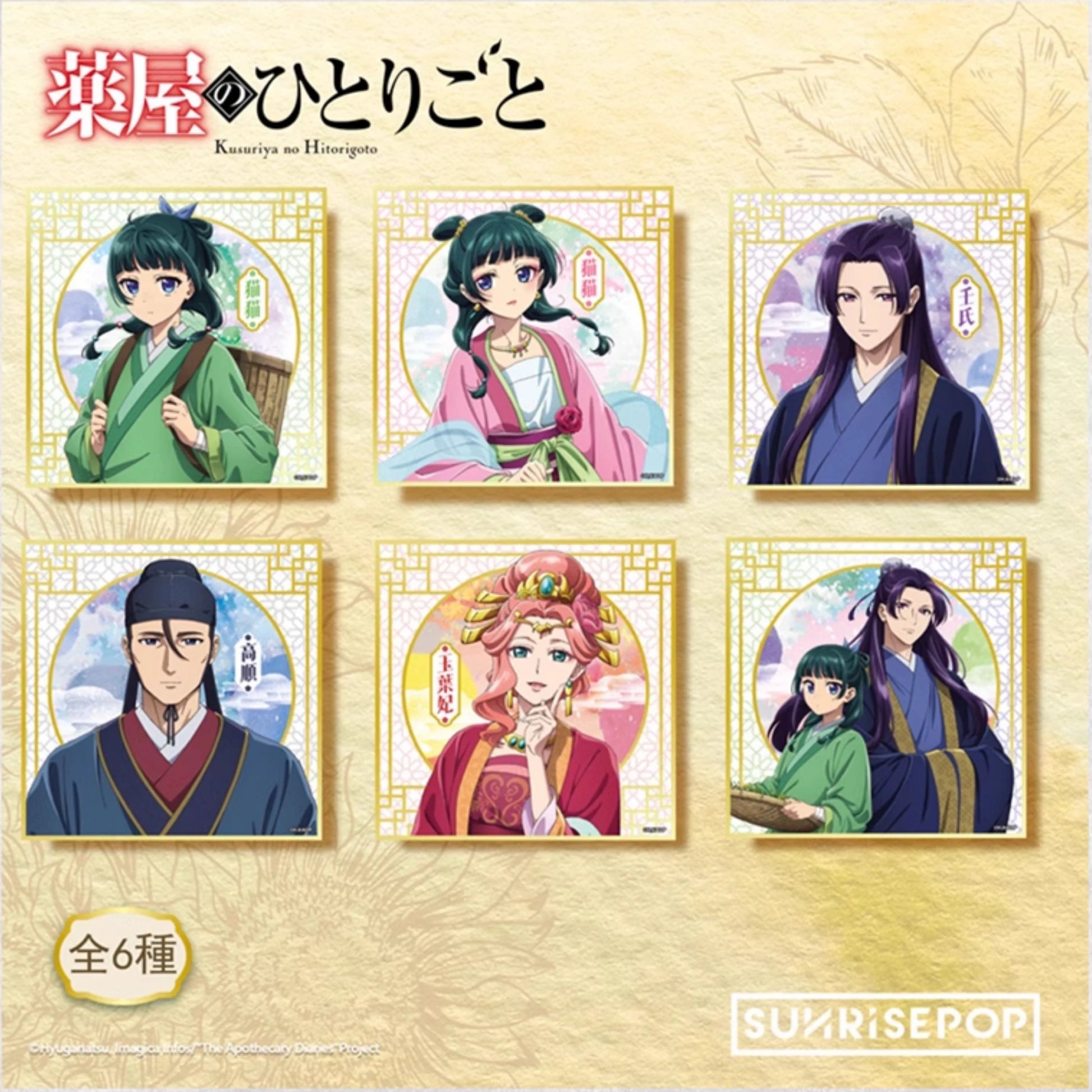 Discover the exquisite world of The Apothecary Diaries with these premium blind box art boards, featuring six characters in breathtaking formal wear. Each 130x130mm shikishi showcases stunning ceremonial designs with special artistic treatments.